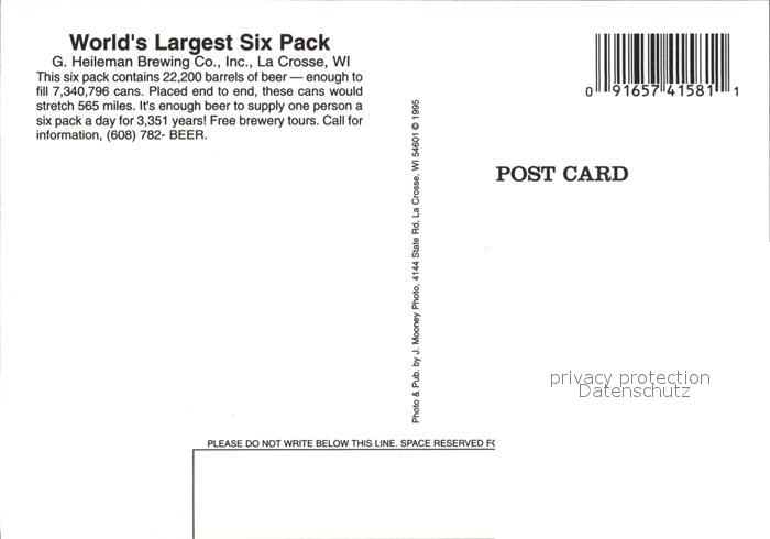 Bier World s Largest Six Pack G. Heileman Beer La Crosse Wisconsin postalisch nicht gelaufen Erhaltung siehe scans [PaolaD17]