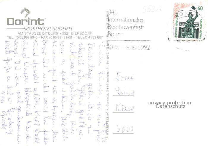 74055122 alte Postkarte Biersdorf See Eifelkreis Dorint Sporthotel Suedeifel am Stausee Bitburg postalisch gelaufen Fliegeraufnahme Erhaltung siehe scans [WerneD78] KatCode: 11110007232015