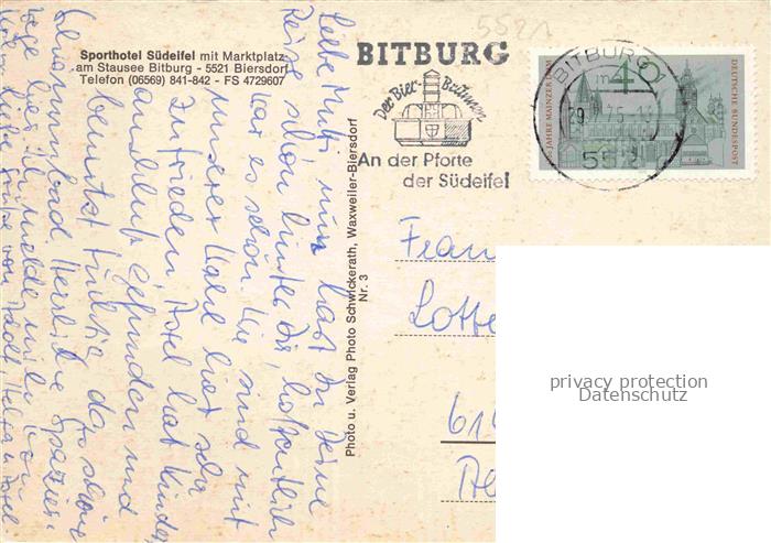 74055158 alte Postkarte Biersdorf See Eifelkreis Sporthotel Suedeifel mit Marktplatz am Stausee Bitburg postalisch gelaufen Erhaltung siehe scans [WerneD78] KatCode: 11110007232015