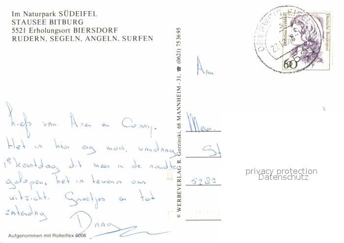 72860249 alte Postkarte Biersdorf See Fliegeraufnahme Stausee Bitburg postalisch gelaufen Erhaltung siehe scans [AndreD76] KatCode: 11110007232015