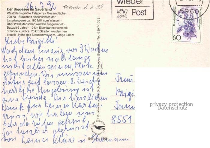 74025109 alte Postkarte Biggesee Westfalens groesste Talsperre postalisch gelaufen Fliegeraufnahme Erhaltung siehe scans [FriedD77] KatCode: 11110005958036