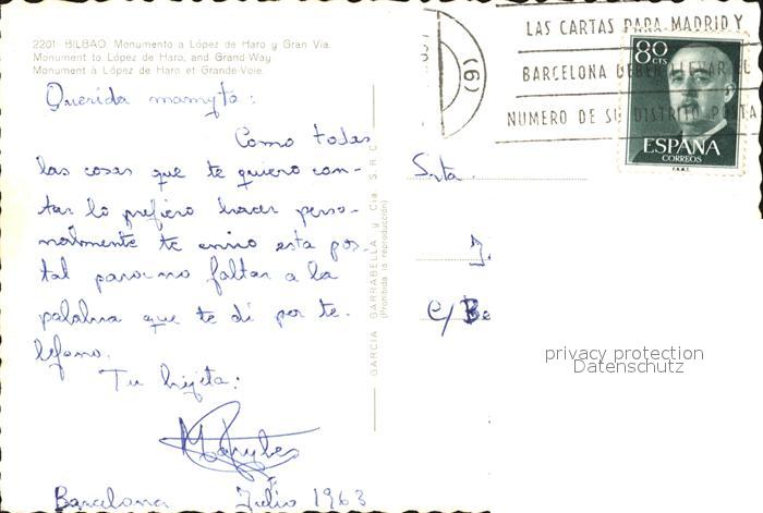 old postcard Bilbao Espana Monumento a Lopez de Haro y Gran Via postalisch gelaufen Erhaltung siehe scans [FriedD77]