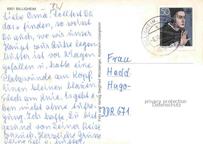 74091755 alte Postkarte Billigheim Baden Neckar-Odenwald-Krei BW Luftaufnahme Kirche postalisch gelaufen Erhaltung siehe scans [IrynaD87] KatCode: 11110008225009