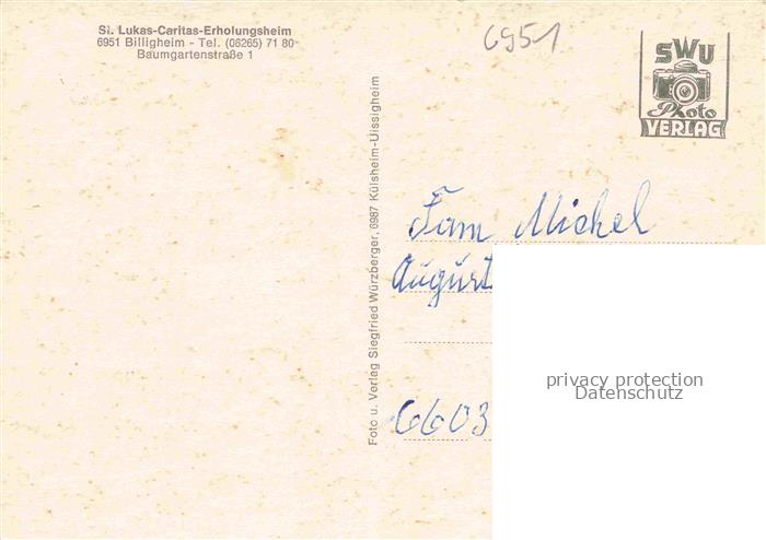 74047946 Billigheim Baden Neckar-Odenwald-Krei BW St Lukas Caritas Erholungsheim postalisch nicht gelaufen Erhaltung siehe scans [WerneD78] KatCode: 11110008225009
