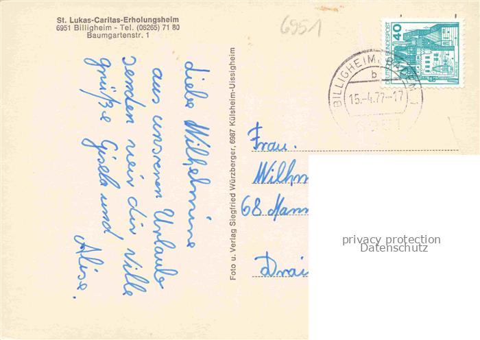 74048265 alte Postkarte Billigheim Baden Neckar-Odenwald-Krei BW St. Lukas-Caritas-Erholungsheim Parkanlagen postalisch gelaufen Erhaltung siehe scans [FriedD77] KatCode: 11110008225009