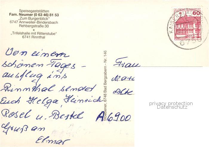73844895 alte Postkarte Bindersbach Speisegaststaetten Ritterstube Trifelshalle Zum Burgenblick postalisch gelaufen Erhaltung siehe scans [FriedD77] KatCode: 11110007337501