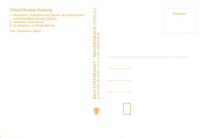 73879830 Bindow Ferienheim Zellstoffmacher Klause Gasthaus Tante Anna Am Ziestsee An der Dahme postalisch nicht gelaufen Erhaltung siehe scans [FriedD77] KatCode: 11110012061217