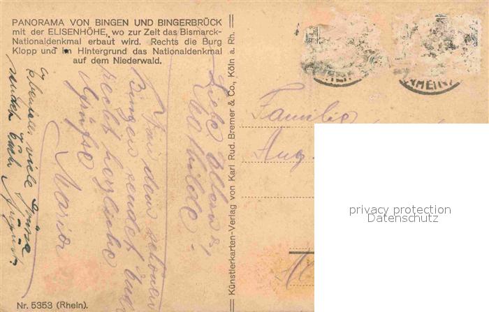 72684840 alte Postkarte Bingen Rhein Bingenbrueck Elisenhoehe Nationaldenkmal Burg Klopp postalisch gelaufen Erhaltung siehe scans [NatalD47] KatCode: 11110007339005