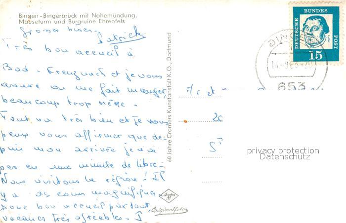 73101260 alte Postkarte Bingen Rhein Bingerbrueck Nahemuendung Maeuseturm Burgruine Ehrenfels postalisch gelaufen Erhaltung siehe scans [KathaD81] KatCode: 11110007339005
