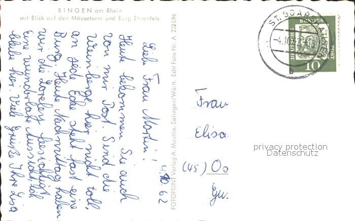 71893240 alte Postkarte Bingen Rhein Blick Maeuseturm Burg Ehrenfels postalisch gelaufen Erhaltung siehe scans KatCode: 11110007339005