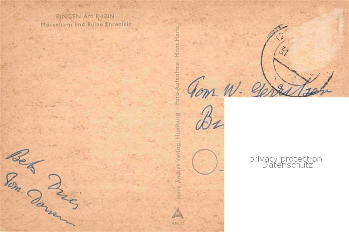 72665383 alte Postkarte Bingen Rhein Maeuseturm mit Ruine Ehrenfels postalisch gelaufen Erhaltung siehe scans [WerneD78] KatCode: 11110007339005