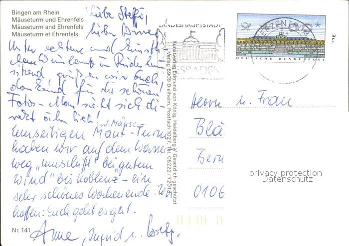 72407238 alte Postkarte Bingen Rhein Maeuseturm und Ehrenfels postalisch gelaufen Erhaltung siehe scans KatCode: 11110007339005