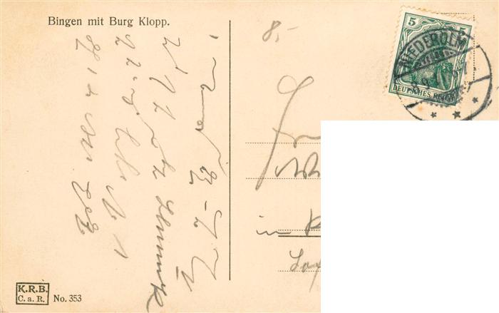 73948909 alte Postkarte Bingen Rhein Panorama Blick zur Burg Klopp postalisch gelaufen Erhaltung siehe scans [FriedD77] KatCode: 11110007339005