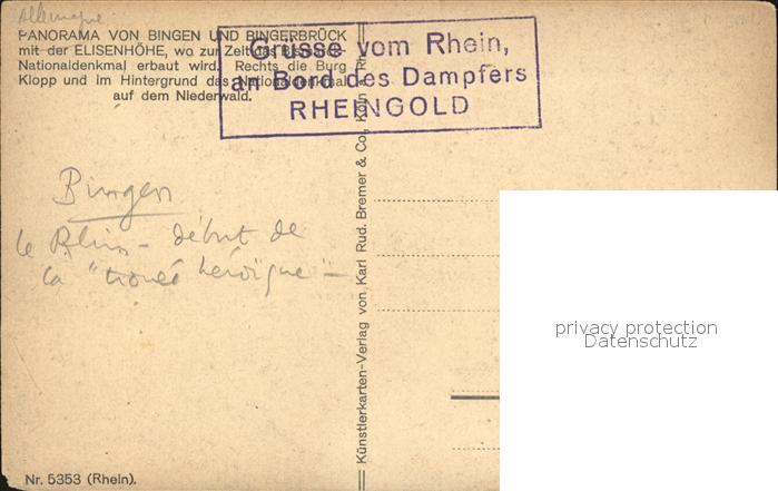 72422382 Bingen Rhein Rheinpartie Kuenstlerkarte mit Elisenhoehe postalisch nicht gelaufen Erhaltung siehe scans KatCode: 11110007339005