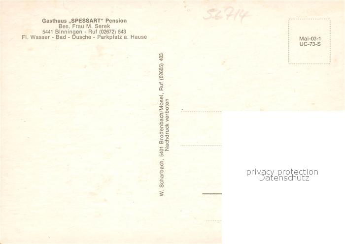 73857935 Binningen Eifel Gasthaus Pension Spessart postalisch nicht gelaufen Erhaltung siehe scans [FriedD77] KatCode: 11110007135009