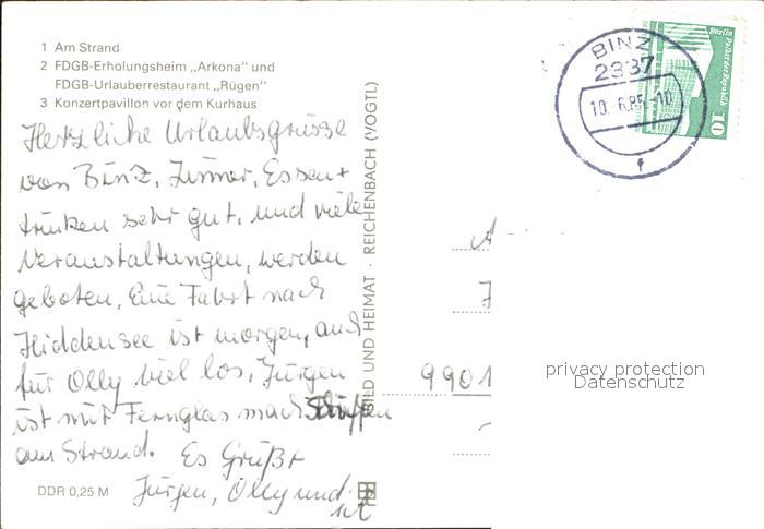72474665 alte Postkarte Binz Ruegen Am Strand Erholungsheim Arkona Urlauberrestaurant Ruegen Konzertpavillon postalisch gelaufen Erhaltung siehe scans KatCode: 11110013061005