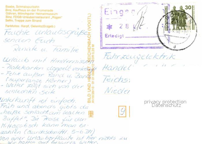 72655928 alte Postkarte Binz Ruegen Baabe Goehren Sellin postalisch gelaufen Erhaltung siehe scans [LiesaD40] KatCode: 11110013061005