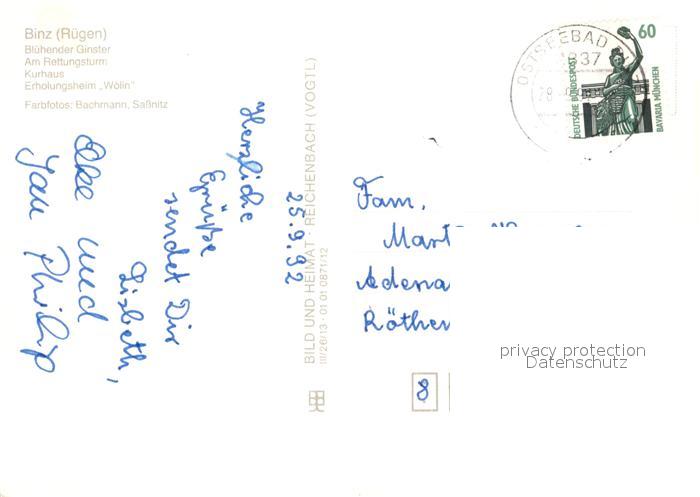 73029910 alte Postkarte Binz Ruegen Bluehender Ginster Rettungsturm Kurhaus Erholungsheim Woelln postalisch gelaufen Erhaltung siehe scans [KathaD81] KatCode: 11110013061005