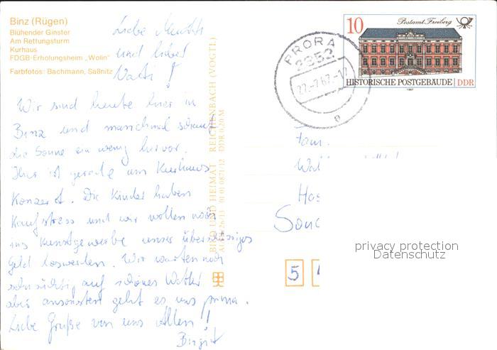 72177898 alte Postkarte Binz Ruegen Bluehender Ginster Rettungsturm Kurhaus postalisch gelaufen Erhaltung siehe scans KatCode: 11110013061005