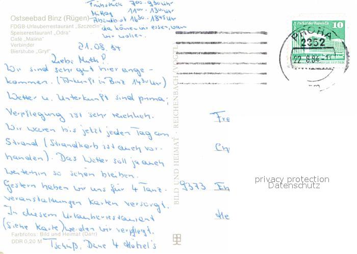 72617369 alte Postkarte Binz Ruegen FDGB Restaurant Szczecin Speiserestaurant Odra Cafe Malina Verbinder Bierstube Gryf postalisch gelaufen Erhaltung siehe scans [WerneD78] KatCode: 11110013061005
