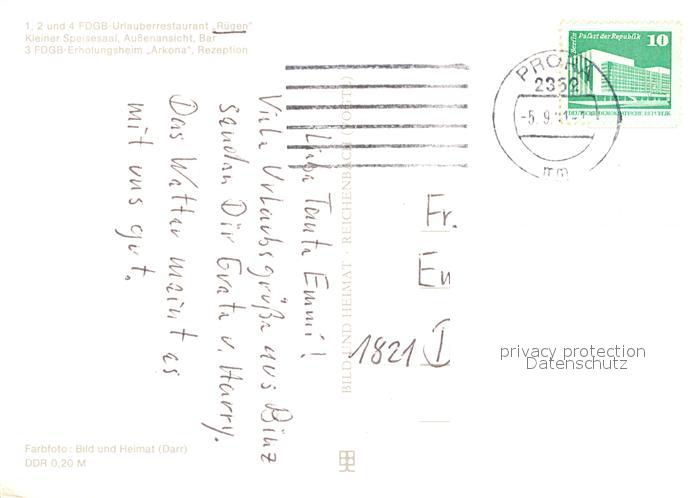 72986463 alte Postkarte Binz Ruegen FDGB Urlauberrestaurant Ruegen Kl Speisesaal Bar FDGB Erholungsheim Arkona Rezeption postalisch gelaufen Erhaltung siehe scans [WerneD78] KatCode: 11110013061005