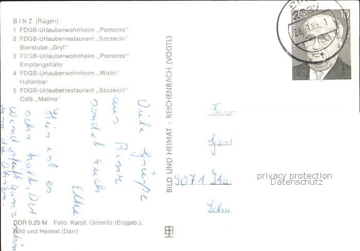 72427310 alte Postkarte Binz Ruegen Ferienheime Pomorze Szczecin Wolin postalisch gelaufen Erhaltung siehe scans KatCode: 11110013061005