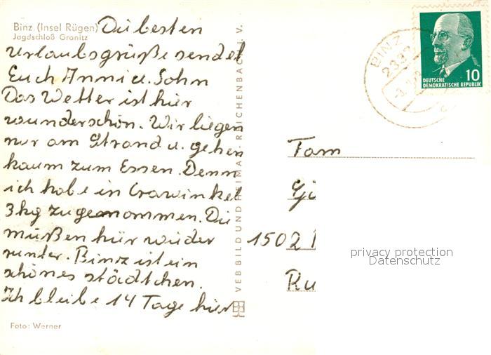 73046219 alte Postkarte Binz Ruegen Jagdschloss Granitz postalisch gelaufen Erhaltung siehe scans [KathaD81] KatCode: 11110013061005