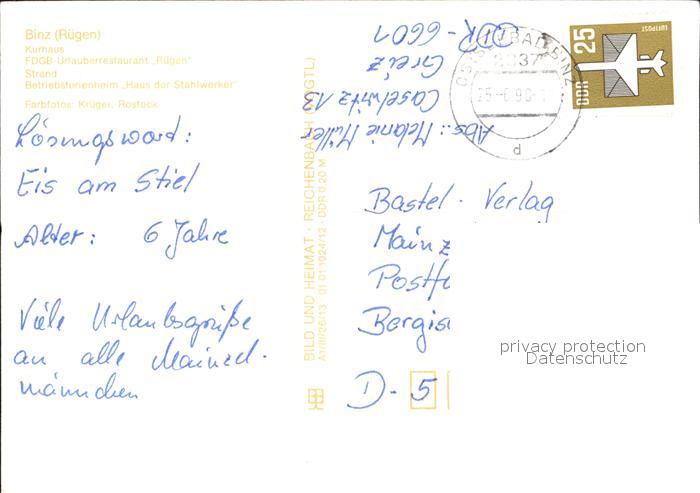 72459734 alte Postkarte Binz Ruegen Kurhaus FDGB Urlauberrestaurant Strand Betriebsferienheim postalisch gelaufen Erhaltung siehe scans KatCode: 11110013061005