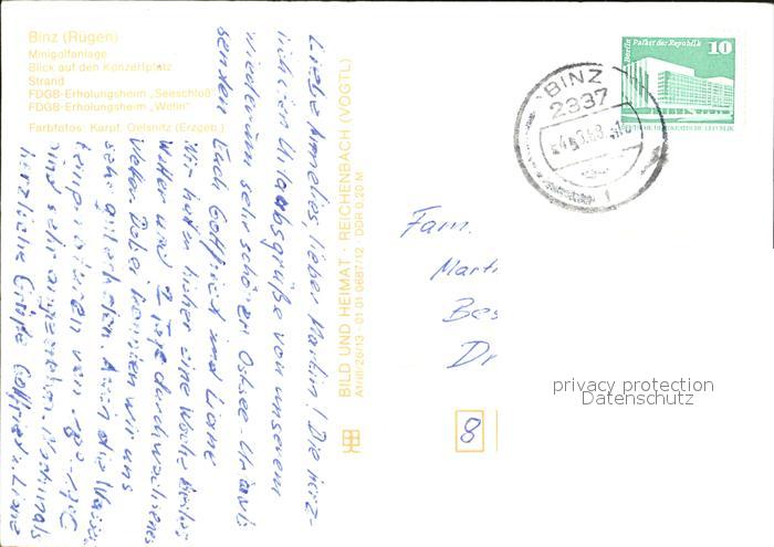 72586799 alte Postkarte Binz Ruegen Minigolf Konzertplatz Strand FDGB Erholungsheime Seeschloss und Wolin postalisch gelaufen Erhaltung siehe scans [WerneD78] KatCode: 11110013061005