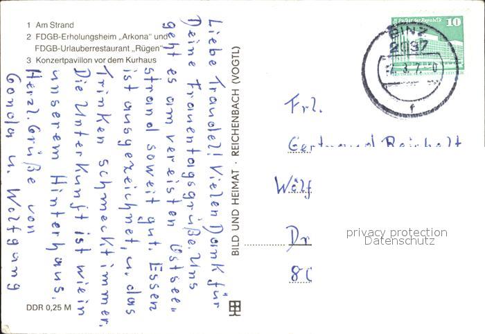 72400658 alte Postkarte Binz Ruegen Strand Erholungsheime Arkona und Ruegen Kurhaus Konzertpavillon postalisch gelaufen Erhaltung siehe scans KatCode: 11110013061005