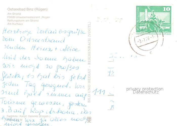 73144898 alte Postkarte Binz Ruegen Strand FDGB Urlauberrestaurant Ruegen Rettungsturm Kurhaus postalisch gelaufen Erhaltung siehe scans [FriedD77] KatCode: 11110013061005