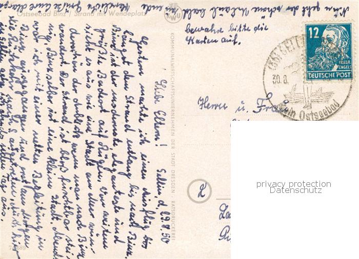 73757042 alte Postkarte Binz Ruegen Strand mit Wendeplatz postalisch gelaufen Erhaltung siehe scans [WerneD78] KatCode: 11110013061005