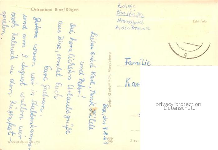 73259136 alte Postkarte Binz Ruegen postalisch gelaufen Erhaltung siehe scans [NatalD47] KatCode: 11110013061005