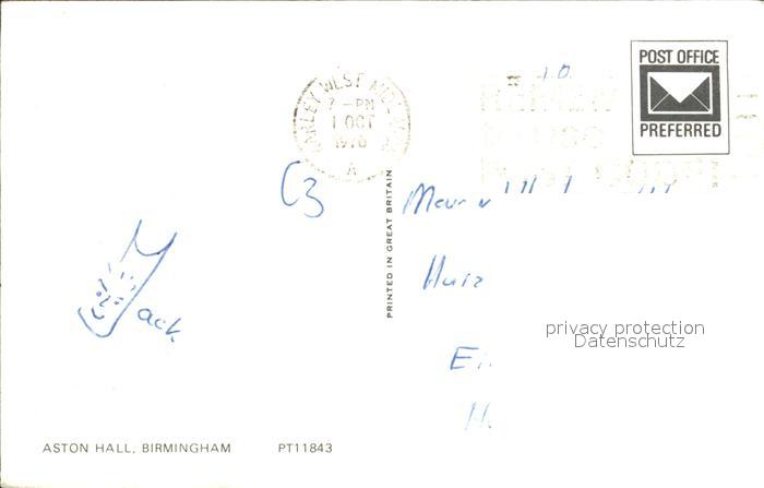 old postcard Birmingham Aston Hall postalisch gelaufen Erhaltung siehe scans