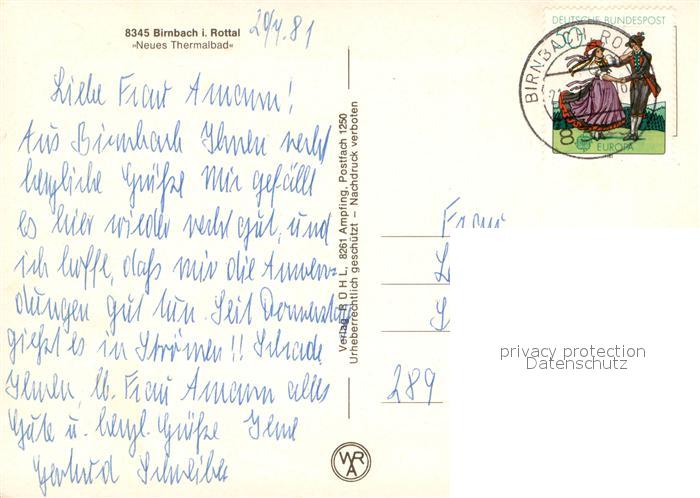 73672486 alte Postkarte Birnbach Rottal Neues Thermalbad Aussenbecken postalisch gelaufen Erhaltung siehe scans [FriedD77] KatCode: 11110009277113