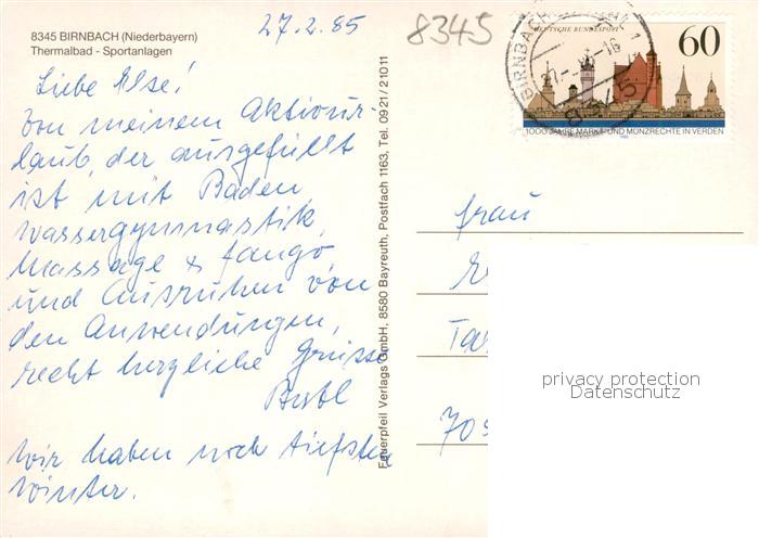 73868505 alte Postkarte Birnbach Rottal Rottal Terme Thermalbad Sportanlagen Terrasse Brunnen postalisch gelaufen Erhaltung siehe scans [WerneD78] KatCode: 11110009277113