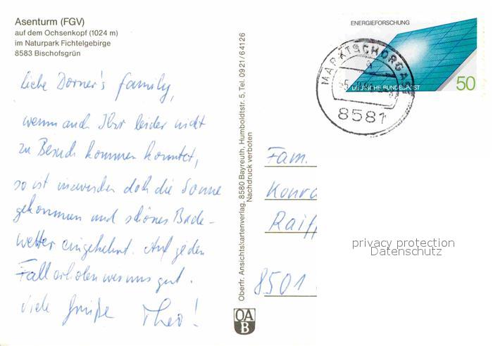 72716656 alte Postkarte Bischofsgruen Asenturm postalisch gelaufen Erhaltung siehe scans [LiesaD40] KatCode: 11110009472121