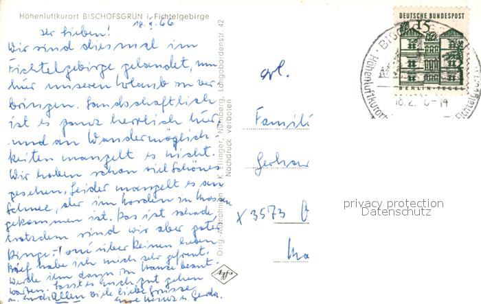 73334156 alte Postkarte Bischofsgruen Blick vom Huegelelsen von der Fichtelgebirgsstrasse vom Bergcafe vom Ochsenkopf postalisch gelaufen Erhaltung siehe scans [WerneD78] KatCode: 11110009472121