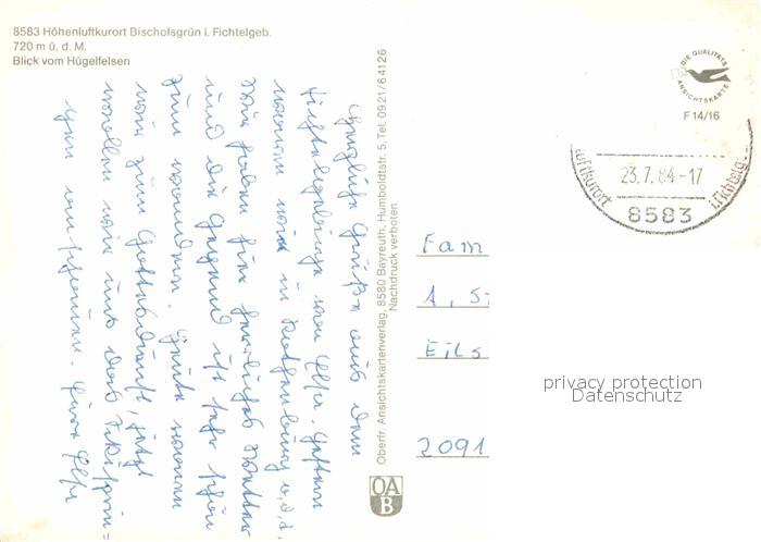 72869416 alte Postkarte Bischofsgruen Blick vom Huegelfelsen postalisch gelaufen Erhaltung siehe scans [NatalD47] KatCode: 11110009472121