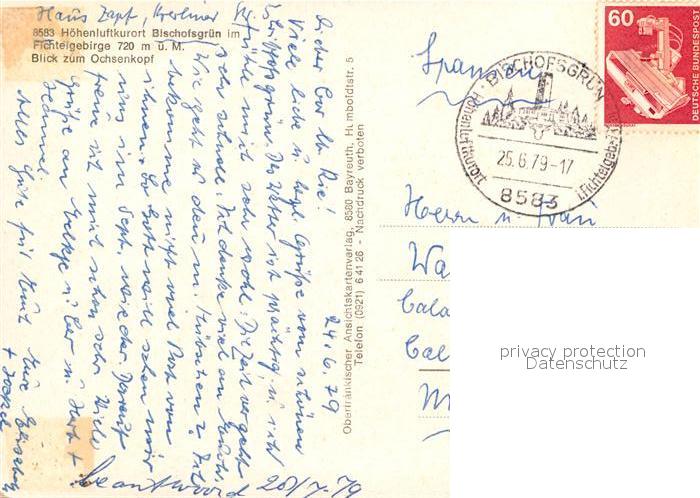 72929764 alte Postkarte Bischofsgruen Blick zum Ochsenkopf postalisch gelaufen Erhaltung siehe scans [WerneD78] KatCode: 11110009472121