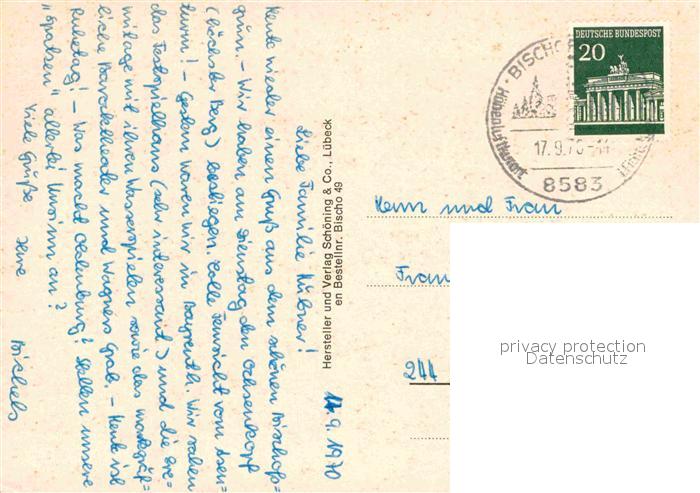 72886829 alte Postkarte Bischofsgruen Ev Kirche Ehrenmal Huegelfelsen Fernsehturm Ostmarkstr Postplatz Ochsenkopfturm postalisch gelaufen Erhaltung siehe scans [WerneD78] KatCode: 11110009472121