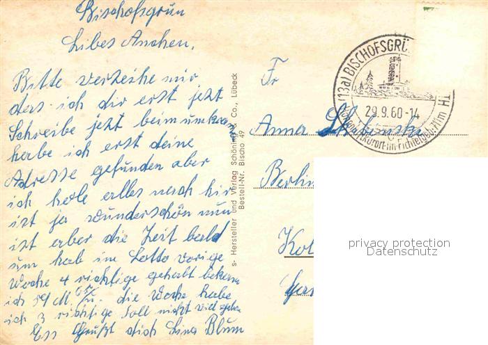 72823034 alte Postkarte Bischofsgruen Evangelische Kirche Ehrenmal Fersehturm Postplatz Ochsenkopfturm postalisch gelaufen Erhaltung siehe scans [AndreD76] KatCode: 11110009472121