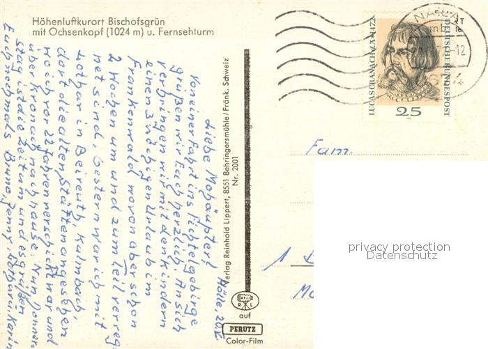 73701779 alte Postkarte Bischofsgruen Fliegeraufnahme mit Ochsenkopf und Fernsehturm postalisch gelaufen Erhaltung siehe scans [WerneD78] KatCode: 11110009472121