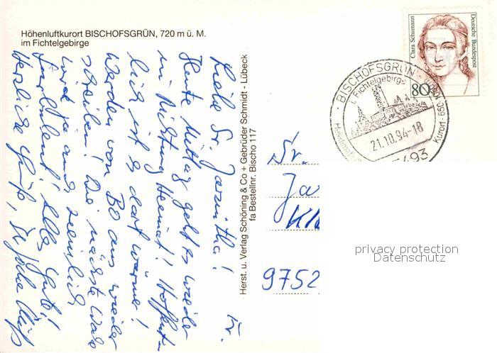 72742209 alte Postkarte Bischofsgruen Hauptstrasse Rathaus Panorama Hoehenluftkurort Fichtelgebirge Sessellift postalisch gelaufen Erhaltung siehe scans [FriedD77] KatCode: 11110009472121