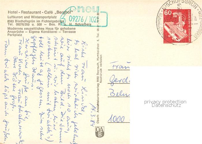 73652911 alte Postkarte Bischofsgruen Hotel Berghof Restaurant Wintersportplatz im Fichtelgebirge postalisch gelaufen Erhaltung siehe scans [FriedD77] KatCode: 11110009472121