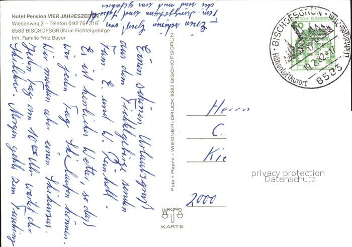 72420491 alte Postkarte Bischofsgruen Hotel Pension Vier Jahreszeiten postalisch gelaufen Erhaltung siehe scans KatCode: 11110009472121