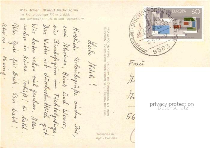72880151 alte Postkarte Bischofsgruen Panorama Hoehenluftkurort im Fichtelgebirge Ochsenkopf Fernsehturm postalisch gelaufen Erhaltung siehe scans [FriedD77] KatCode: 11110009472121