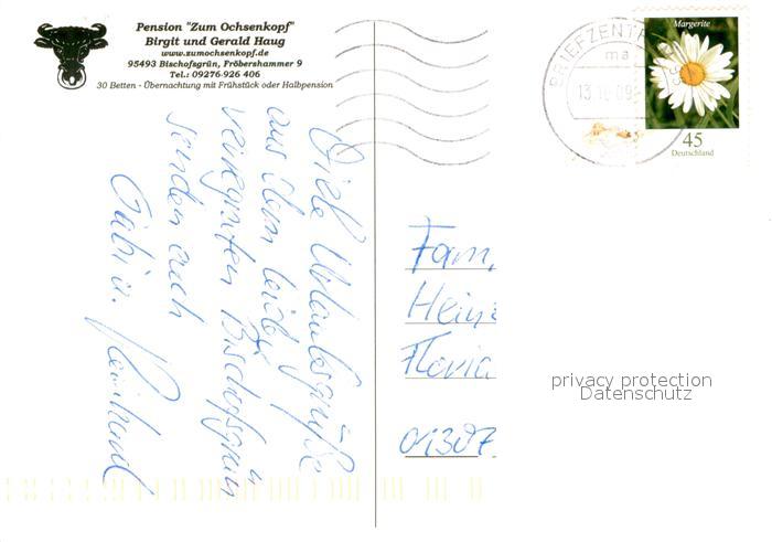 73660114 alte Postkarte Bischofsgruen Pension Zum Ochsenkopf Restaurant Fremdenzimmer postalisch gelaufen Erhaltung siehe scans [FriedD77] KatCode: 11110009472121