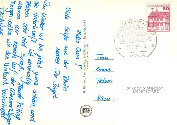 72757366 alte Postkarte Bischofsheim Rhoen Marktbrunnen Centturm Jugendherberge Rothsee Schwimmbad postalisch gelaufen Erhaltung siehe scans [KathaD81] KatCode: 11110009673117