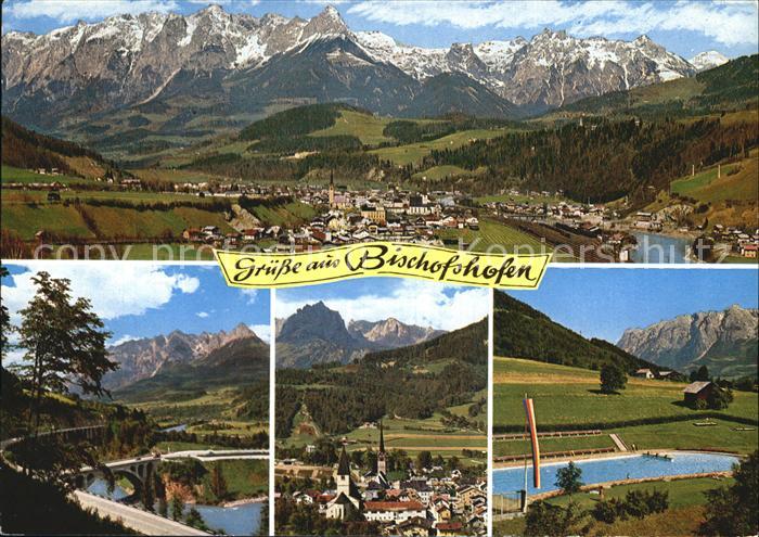 72603528 alte Postkarte Bischofshofen Panorama Salzachtal Alpen Reitsam Schwimmbad Hochkoenig postalisch gelaufen Erhaltung siehe scans [FriedD77] KatCode: 11390322050404